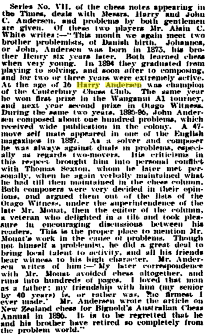 Evening Post 22 January 1923 H. L. Andersen, the Canterbury champion, made his first appearance at the Wanganui Congress (1895-96). Although the. entry list was a formidable one, and he was only sixteen years of age, he tied for fifth' place, and had the satisfaction of defeating the then champion (now Brigadier-General Meldrum). In the following year he again tied for fifth place, and on that occasion made a better tally than four of New Zealand's ex-champions. He then retired, and has consequently now returned to the arena under the big.handicap of a 26-years' absence, which explains why he did not occupy a higher place in the recent tourney. It may be added that Mr. Andersen has more than onoe proved himself New Zealand's champion problem solver.