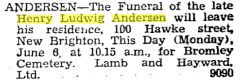 His EDO Rating page is here. ------------------------------------------------------------------------------------------------------- References: [1] Auckland Libraries Heritage Collections NZG-18960208-0143-01 [2] Find a Grave - Henry Ludwig Andersen