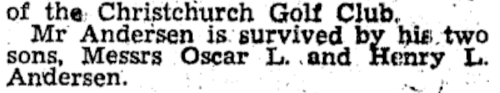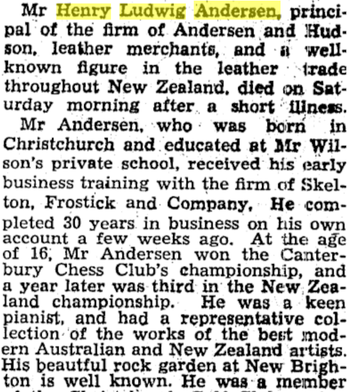 Evening Post 5 July 1938 OBITUARY. Mr. H. L. Andersen, who was only 16 years of age when he made an excellent showing at the Wanganui Congress of 1895-96, died in Christchurch on June 4. He was an ex-president of the Canterbury Chess Club, and was its champion for several years.