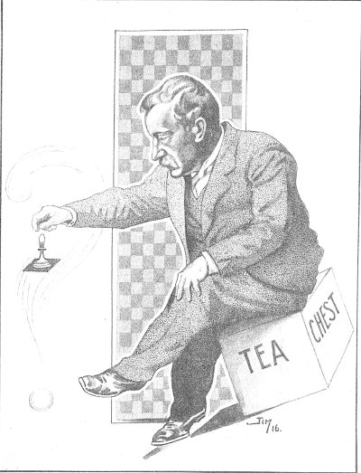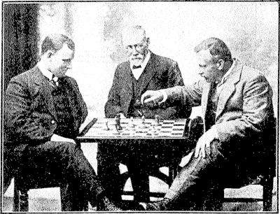 THREE CHAMPIONS OF THE OTAGO CHESS CLUB. H. J. Armstrong (1912), Mr K. A. Cleland (IS&S-7, 1909, 1911), Mr O. Balk (1899, 1903, 1913). The position shown on the board is an original three-mover by Mr Cleland. -Otago Witness, 8/4/1914.
