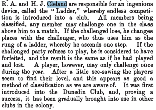 THE AUSTRALIAN CHESS ANNUAL, 1896 (Article by J. C. Andersen) Mr. R. A. Cleland, Otago Chess Club. — President of his club in 1894, vice-president of the New Zealand Chess Association. Won 1st prize Otago Club handicap tourney from scratch in 1891, also in 1892. Tied for club championship, 1893. First holder of Mr. Johnstone's championship trophy in 1894. Playing in three tourneys during 1894-5 scored 43 wins, 2 draws ; and 1 loss. Represented club at championship congress , Christchurch, 1892, taking 6th place, and Dunedin , 1893, winning 3rd prize.