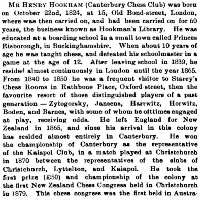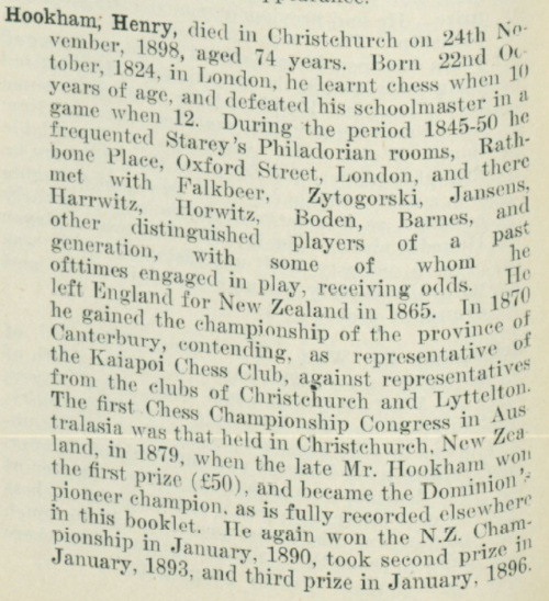 Mr Henry Hookham, one of the oldest chess players in Canterbury, and for some twenty years Chess Editor of the " Canterbury , Times," died yesterday afternoon, at the age of seventy-four years, after a short illness. He was born in London in 1824. In 1850 he became part owner of an oldestablished London library, known as "Hookhani's Libary," and when in 1863 the business was turned into a company Mr Hookham became manager. One of the employees of the firm was Mr S. Tinsley, chess editor of the weekly edition of the London "Times." In 1865 Mr Hookham came with his family to New Zealand, and for some years farmed land at Kaiapoi. For ten years he taught in schools at Kaiapoi Island and Yaldhurst, and in more recent years he lived at Fendalton. At the time of his death he was living at St Albans. It was chiefly in connection with chess that Mr Hookhaui was known in New Zealand. He founded a club at Kaiapoi. and in 1870 won the chess championship of Canterbury. For many years he has been president of the Canterbury Übess Club, and has represented it at nearly . every tournament held in New Zealand. He won the championship of the Goiony in 1879, and for about ten years retained the honour. Again in 1890 he was champion of New Zealand. He ably represented the colony, too, at an Australasian Chess Congress held at Adelaide in 1887. Apart from chess circles, he was widely known as an extremely generous and kindly man and his sympathetic nature led him to take up the study of socialistic and philanthropic schemes. He was .a prominent member of the Fabian and of the Socialist Church at the time of Ijis death. The funeral will take place at the Papanui Churchyard on Saturday afternoon.