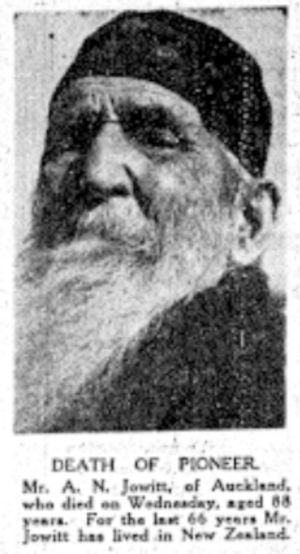 New Zealand Herald 4 April 1928 LATE MR. A. N. JOWITT. TRIBUTE IN PRESBYTERY, Striking tributes to the late Mr. A N. Jowitt were paid at the meeting of the Auckland Presbytery yesterday. Mr. T. McMillan, who moved that the Presbytery should express its sympathy with, the relatives, said Mr. Jowitt had been working in Otago for the Presbyterian Church before some of those who had grey hairs now were born. He was working there in 1861 or 1862, and he used to supply Sunday services in those • days when ministerial services were scant. When he came to Auckland he joined St. Stephen's Church, and then St. David's, of which he was for 41 years a member, for 39 years an elder, and for 24 years its session clerk. He visited prisoners at Mount Eden at appointed services for 25 years, without missing a service. Mr. Jowitt's note was always one of cheerfulness. He moved that the Presbytery convey to the family its sympathy in their loss, and its nigh appreciation of the work Mr. Jowitt had done for the Presbyterian Church throughout his long life. The motion was supported by Mr. J. L. Fairgrav, and carried,
