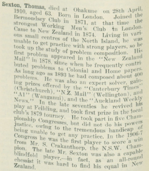 Feilding Star 31 January 1884 Mr T. Sexton, of Makino, was second in the Canterbury Chess Problem Tournament. There were 65 entries.